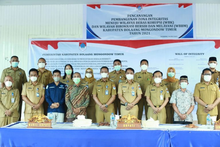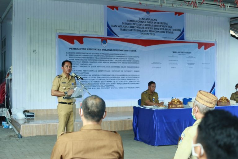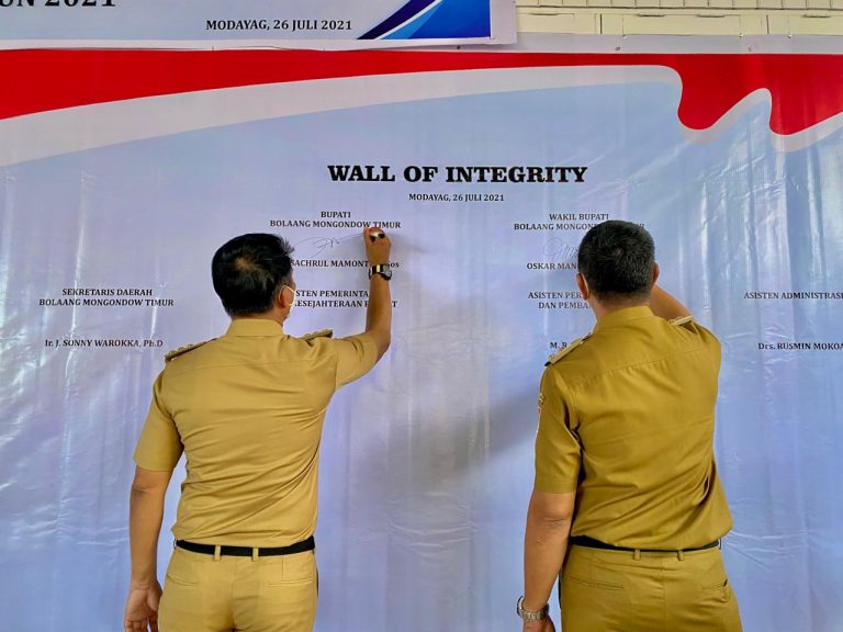 MEDIOnet, BOLTIM – Bupati dan Wakil Bupati (Wabup) Kabupaten Bolaang Mongondow Timur (Boltim), Sam Sachrul Mamonto – Oskar Manoppo, menandatangani penandatanganan Pakta Integritas dalam rangka pencanangan zona integritas menuju Wilayah Bebas Korupsi (WBK) dan Wilayah Birokrasi Bersih dan Melayani tahun 2021 Senin (26/07/2021), bertempat di halaman rumah putih Kecamatan Modayag.