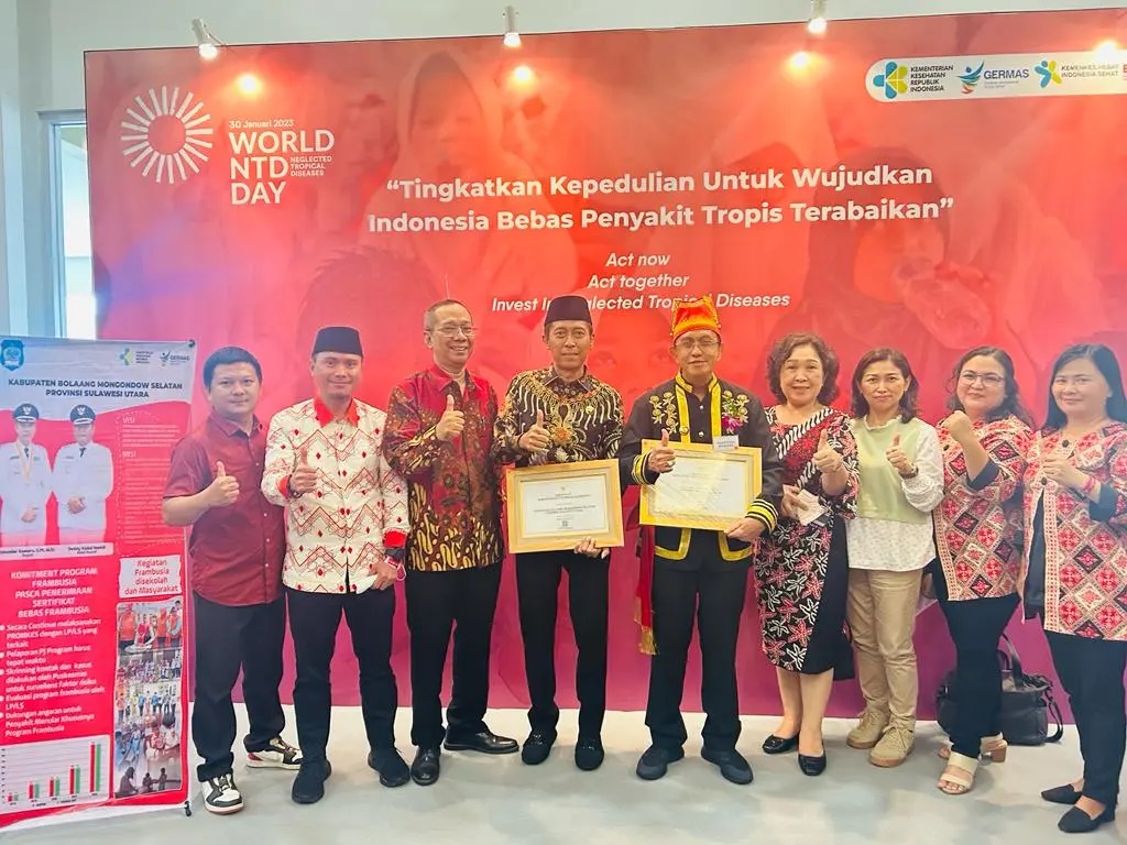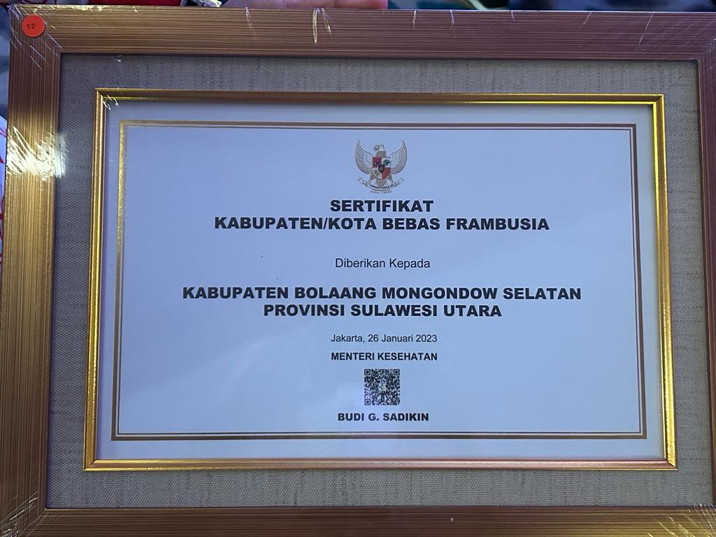Pada peringatan NTBs tersebut, Bupati Bolsel menerima sertifikat Kabupaten bebas frambusia yang diserahkan langsung oleh Menkes RI Budi Gunawan Sadikin.