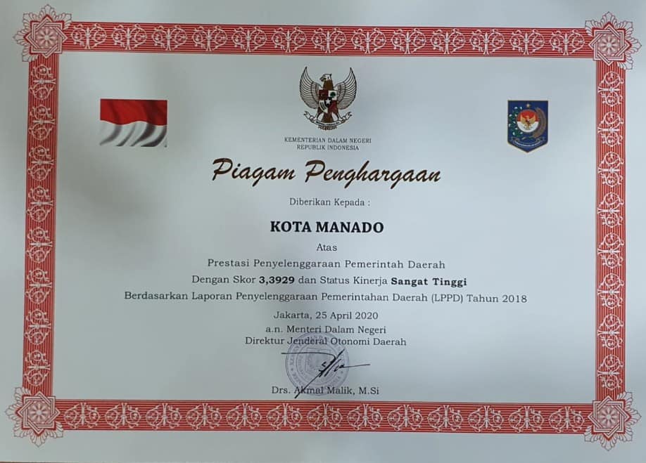 Penghargaan tersebut diserahkan oleh Tim Teknis Evaluasi Penyelenggaraan Pemerintahan Daerah (EPPD), Kasubdit Evaluasi Kinerja Wilayah I Direktorat EKPKD, Faebuadodo Hia dan mewakili Walikota Manado diterima langsung Kabag Pemerintahan dan Humas Pemkot Manado, Drs Sonny Takumansang, M.Si, Kamis 5 November 2020 di Jakarta.
