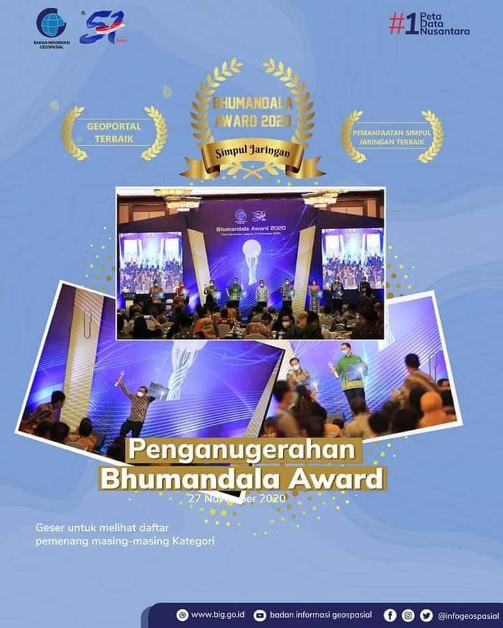 Liny menambahkan, simpul jaringan IG melibatkan banyak OPD Penyelenggaraan Bhumandala Award – Penghargaan Simpul Jaringan Informasi Geospasial telah memasuki tahun keempat sejak pertama kali diselenggarakan tahun 2014. Dalam perjalanannya, proses monitoring dan evaluasi terhadap kinerja simpul jaringan selalu disinergikan dengan Perpres 27 Tahun 2014 tentang Jaringan Informasi Geospasial Nasional.