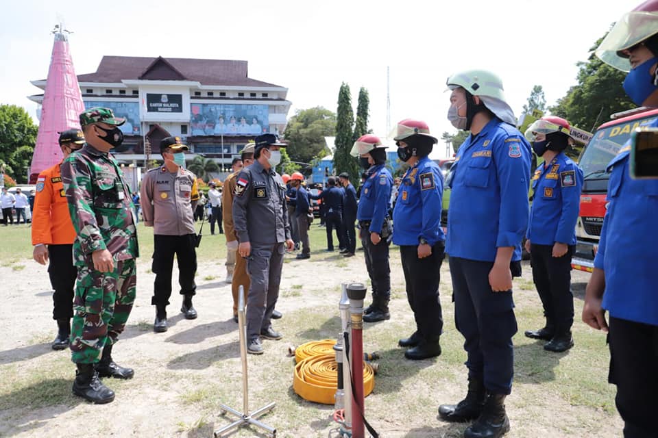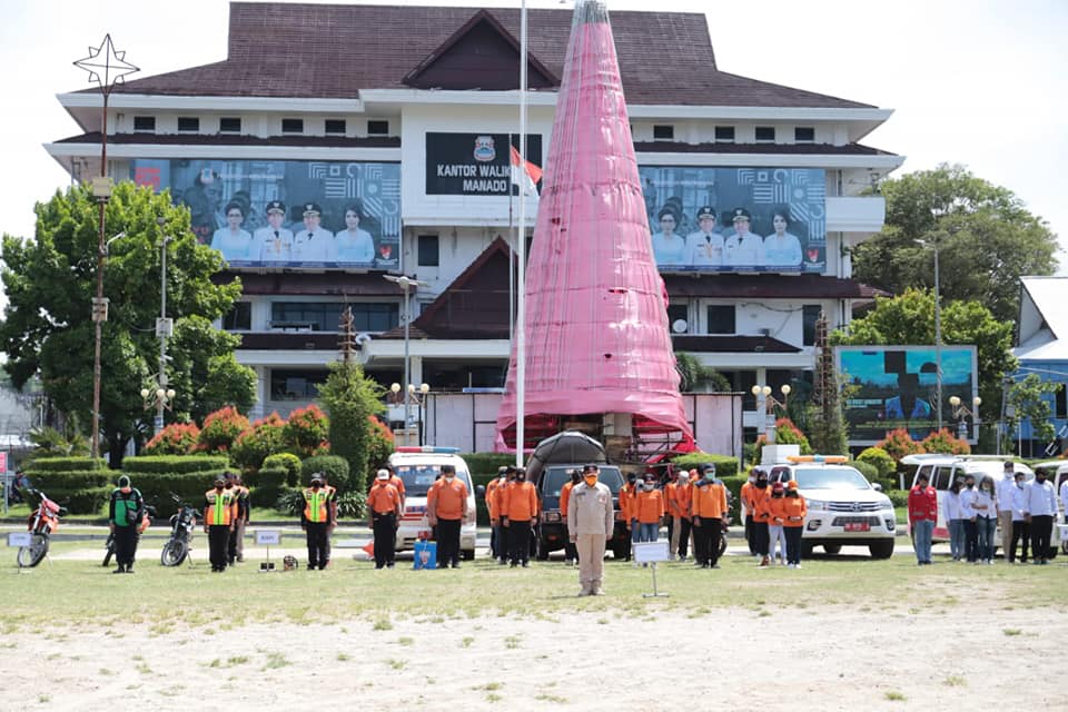 PEMERINTAH Kota Manado menggelar Apel Kesiapsiagaan Pasukan dan Perlengkapan dalam rangka penanggulangan bencana Hydrometeorologi, Jumat, 6 November 2020. Walikota Manado, GS Vicky Lumentut, bertindak selaku Inspektur dan Komandan Apel Kalak BPBD Kota Manado, Donald Sambuaga SSTP, MSi.