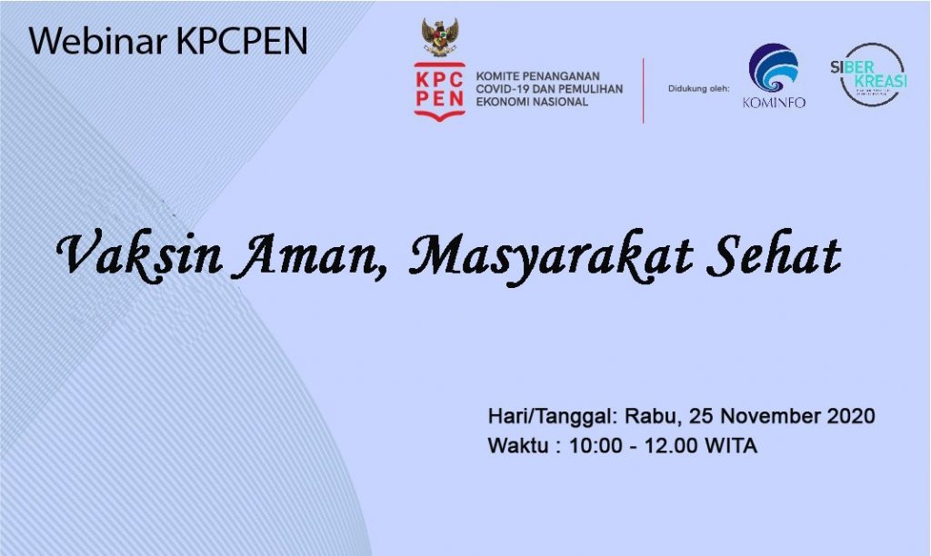Diketahui, webinar Vaksin Aman, Masyarakat Sehat digelar 25 November 2020 dimulai pukul 10.00-12.00 Wita melalui aplikasi zoom di https://bit.ly/3kVOsLI dan dapat di tonton lewat youtube https://bit.ly/36Z1zqD.(***)